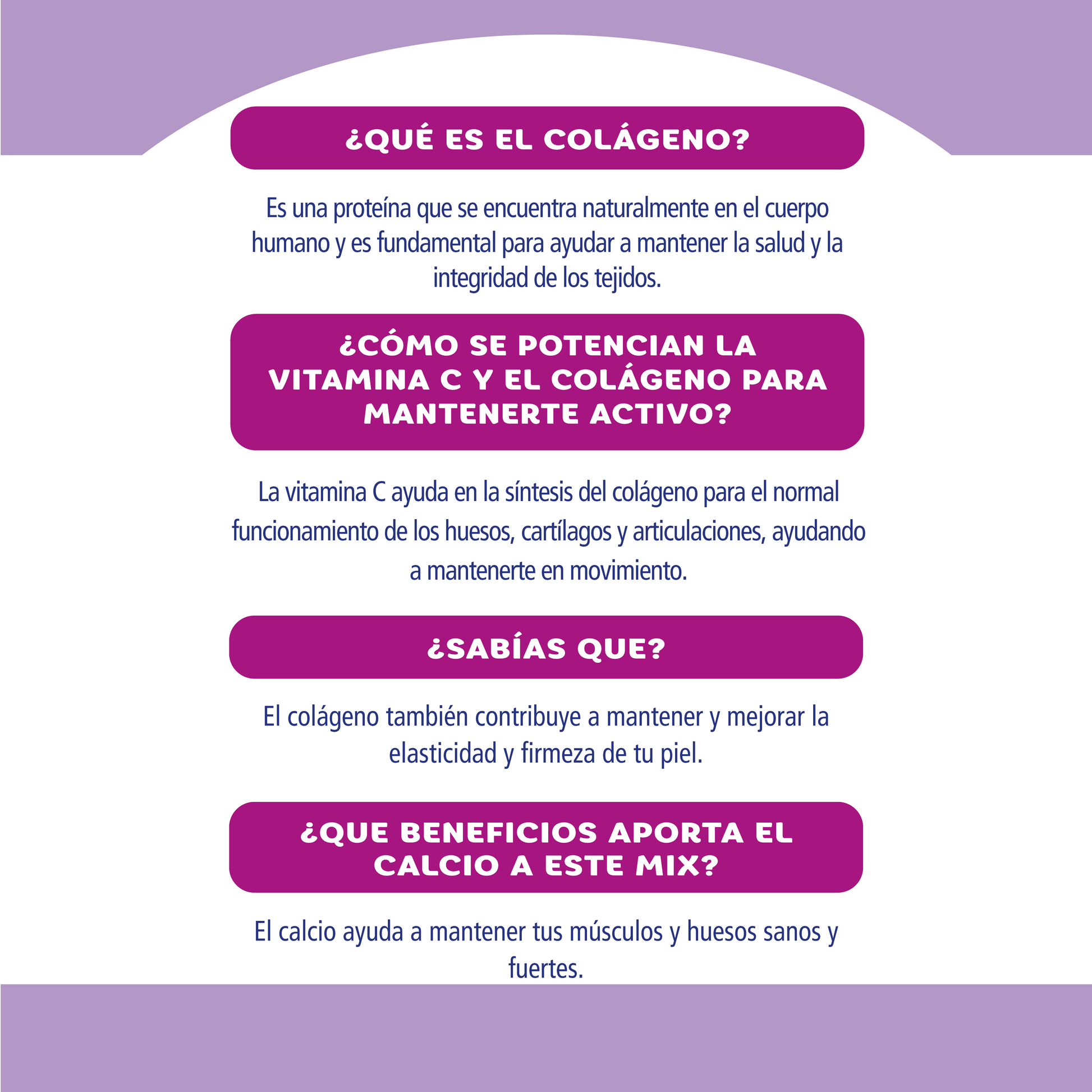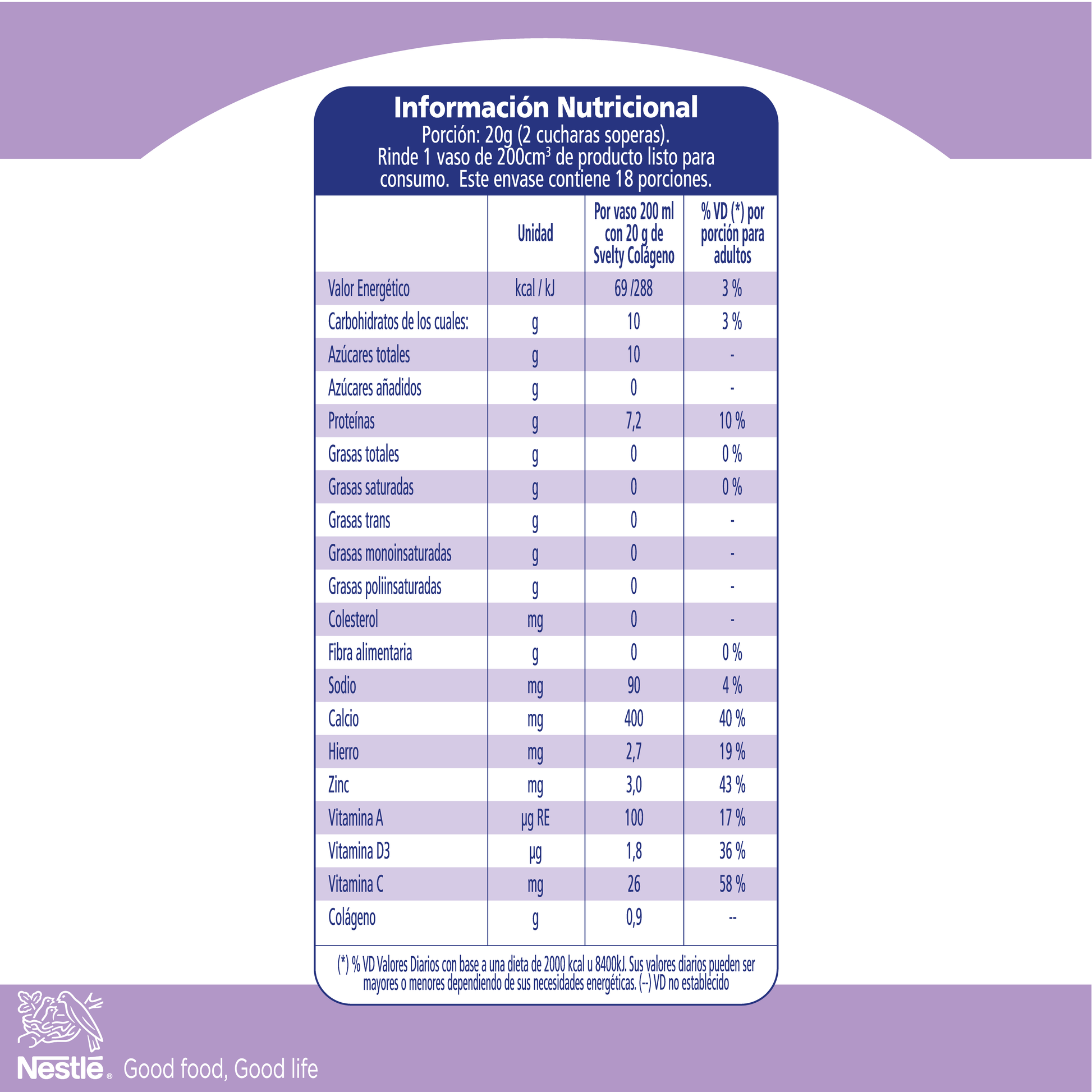 o Ingredientes: Leche descremada, Sólidos de leche, Colágeno hidrolizado, Carbonato de calcio, Vitaminas y minerales: Vitamina C, Vitamina D, Vitamina E, Vitamina A, Vitamina B3, Vitamina B5, Vitamina B6, Vitamina B1, Vitamina K, Biotina, Sulfato de zinc, Sulfato ferroso, Emulsionante (Lecitina de soja). CONTIENE LECHE Y DERIVADOS DE SOJA.